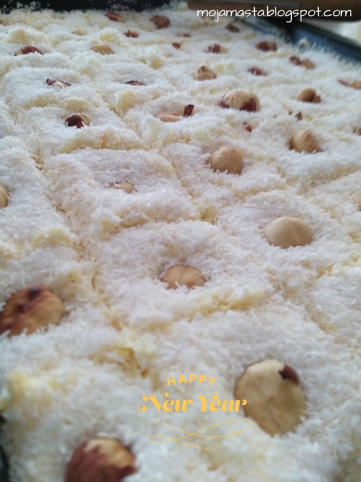Na koru staviti fl, pa posuti sa 50 gr kokosovog brašna. Ostaviti da se ohladi, pa iseći na kocke i na sredinu svake kocke staviti po jedan pečeni lešnik.